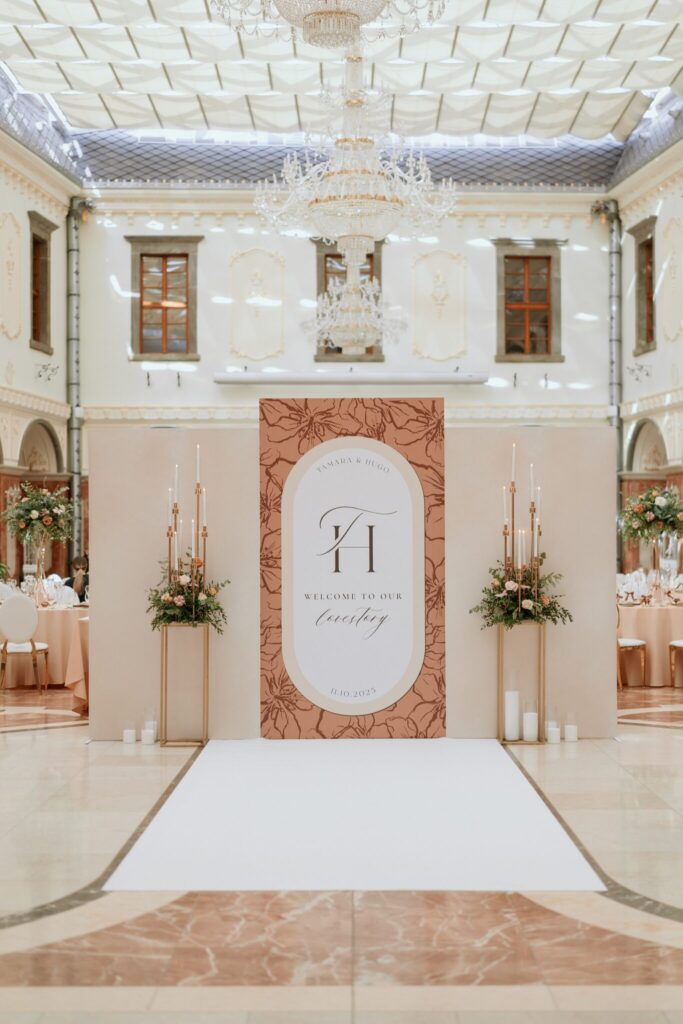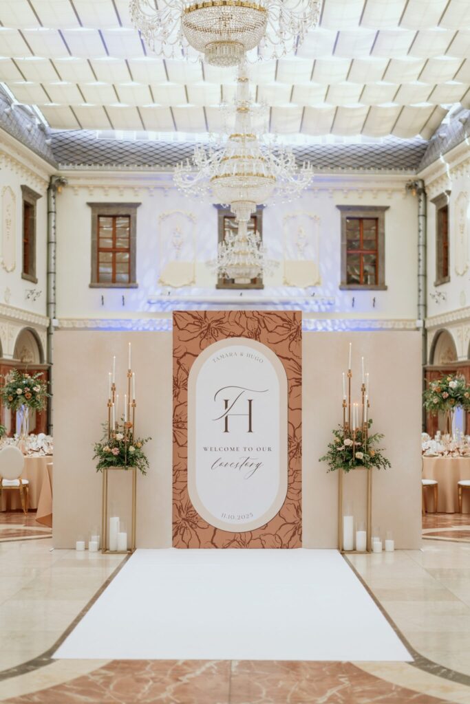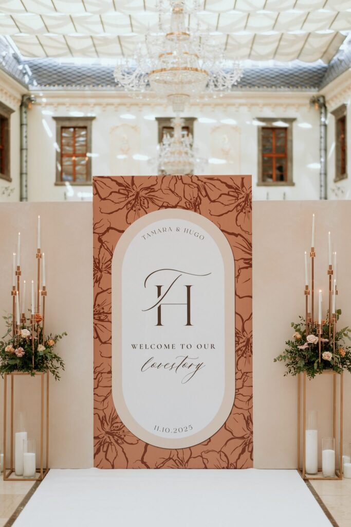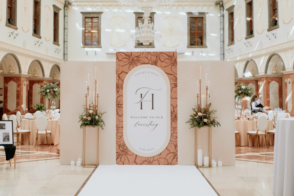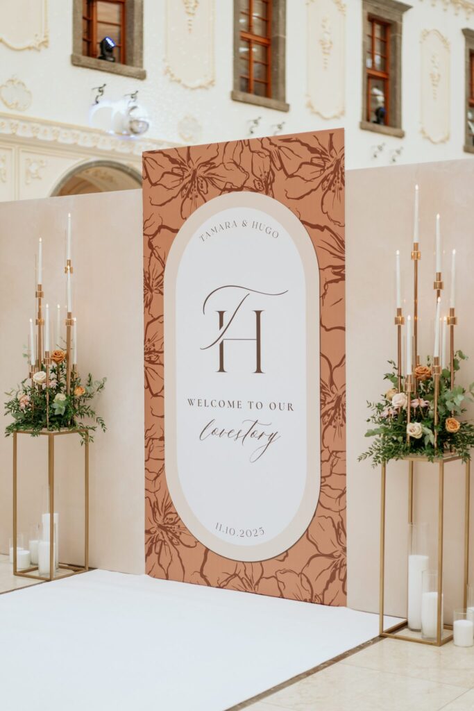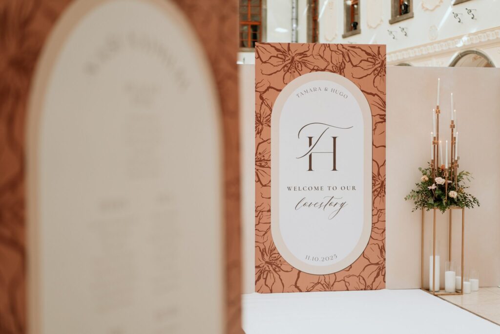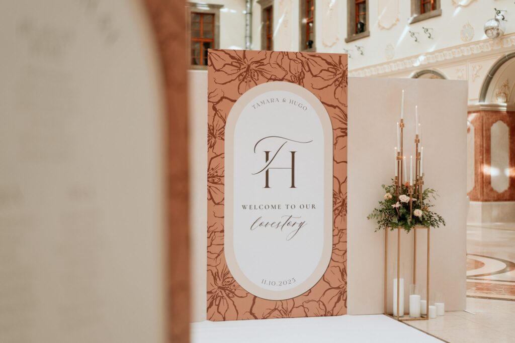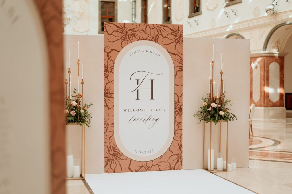 Pre Tamarku a Huga sme pripravili svadobný dizajn Mocha mousse s originálnou uvítacou zónou, ktorá poslúžila ako fotostena pre svadobných hostí a aj ako dokonalé pozadie pre svadobnú romantiku so všetkým, čo k nej patrí :).