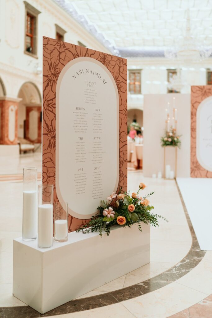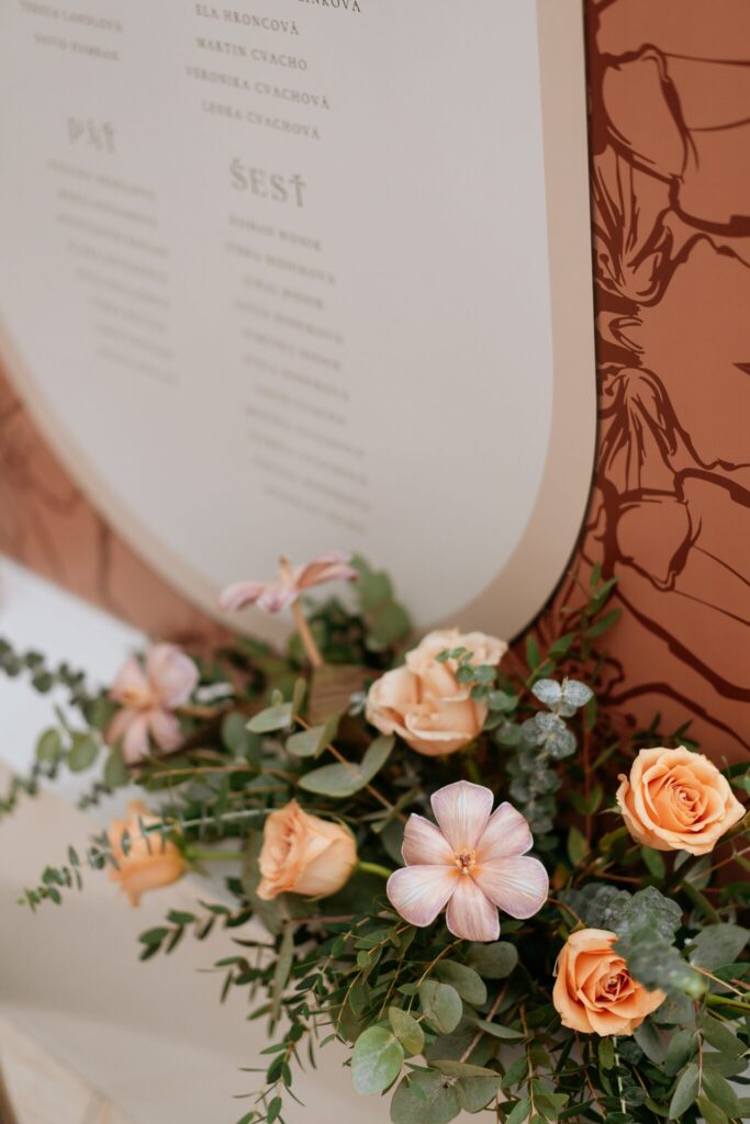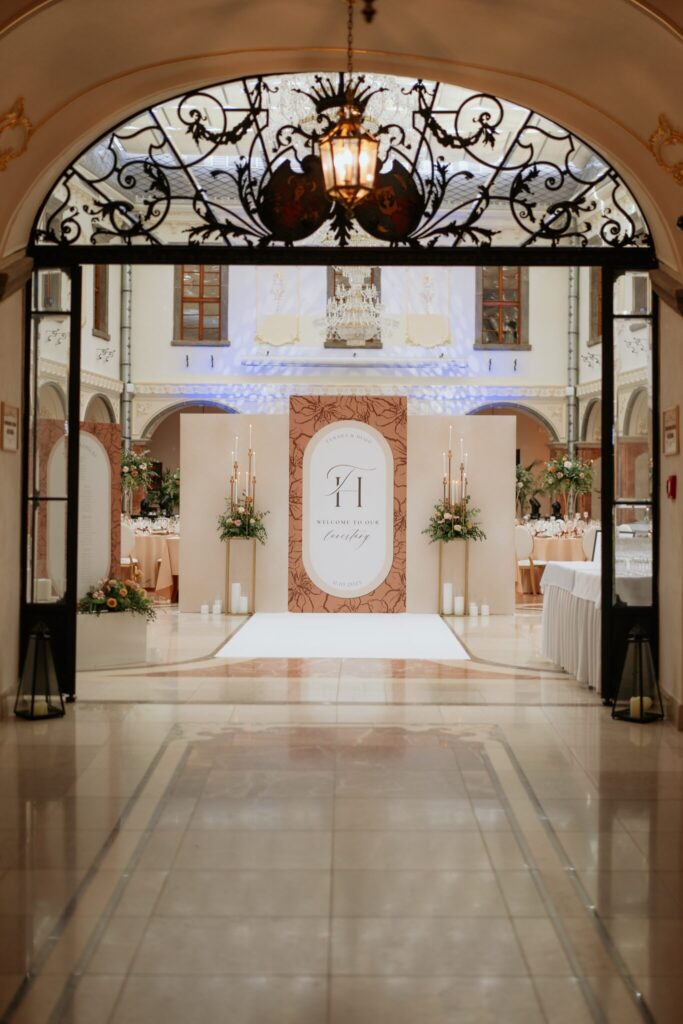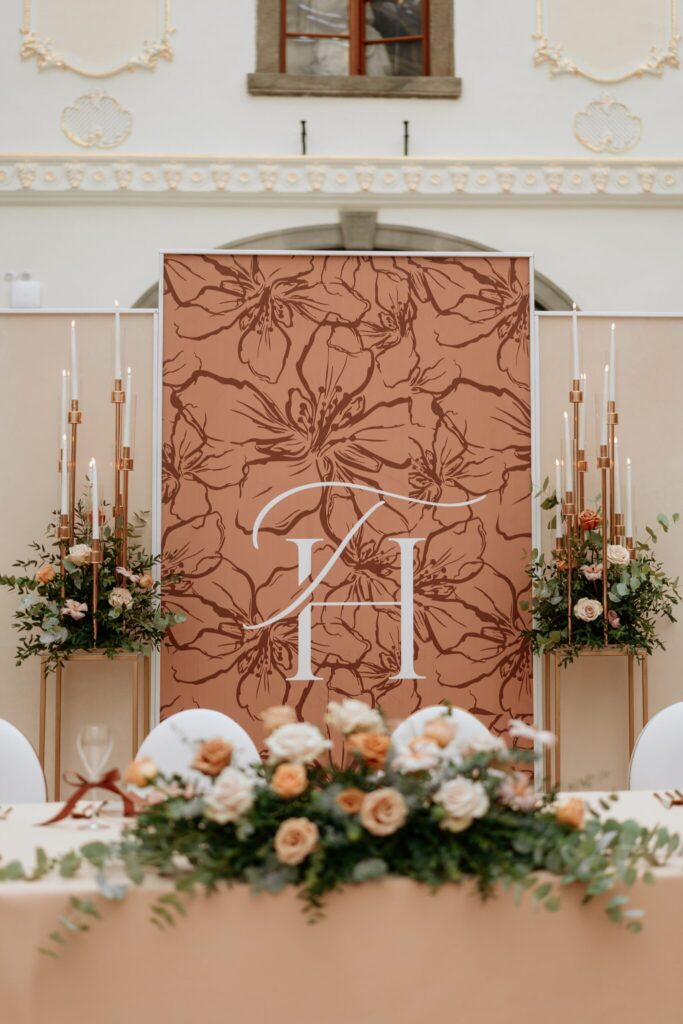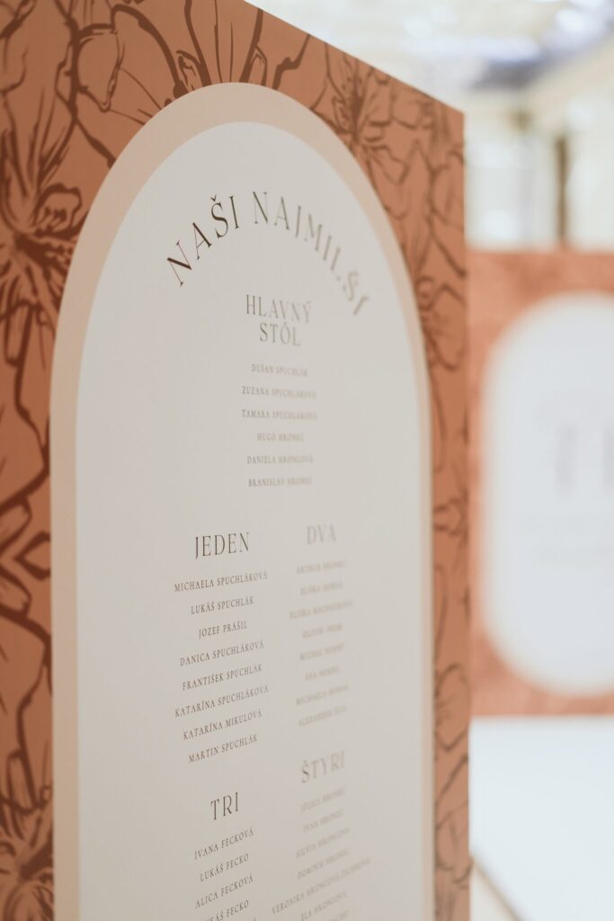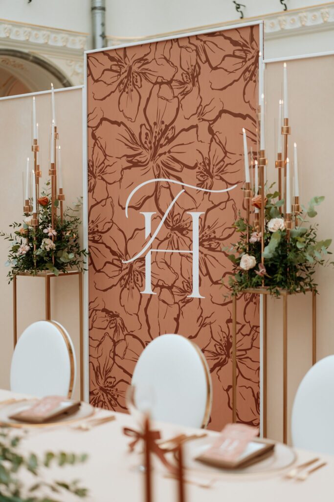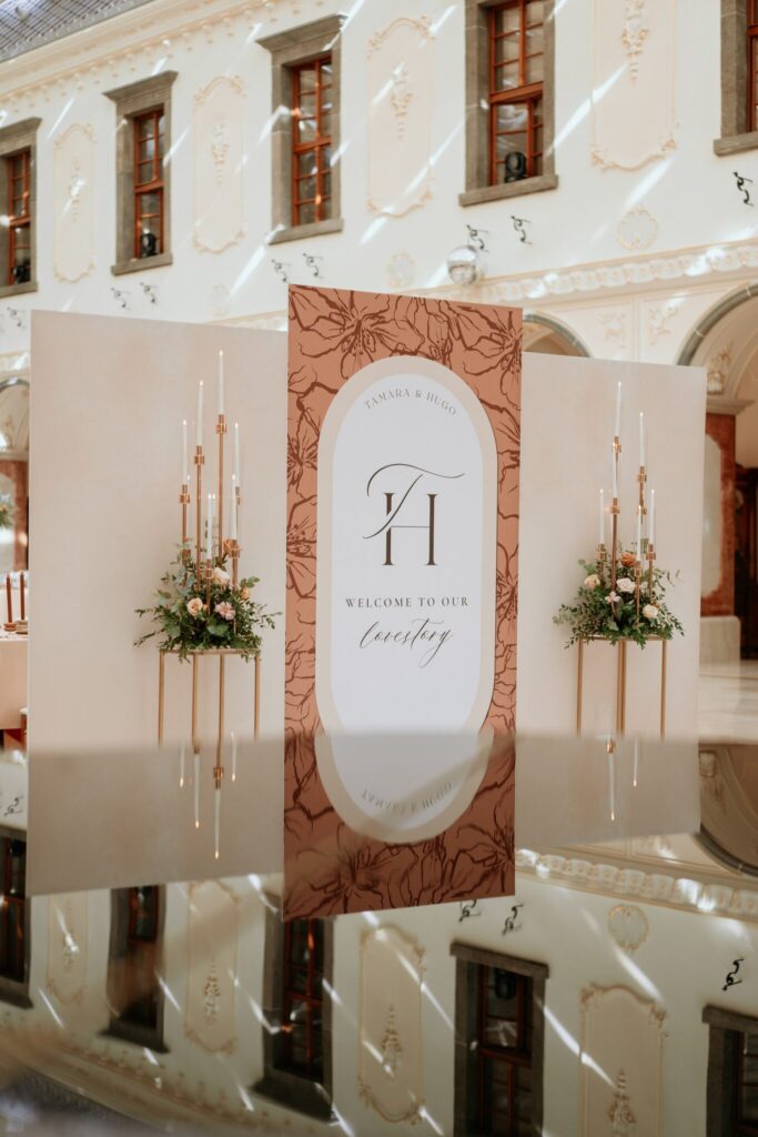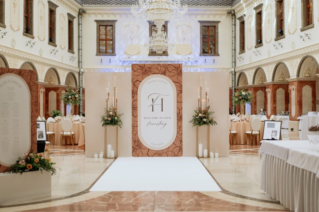 Pre Tamarku a Huga sme pripravili svadobný dizajn Mocha mousse s originálnou uvítacou zónou, ktorá poslúžila ako fotostena pre svadobných hostí a aj ako dokonalé pozadie pre svadobnú romantiku so všetkým, čo k nej patrí :).