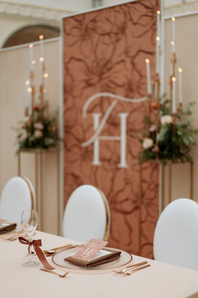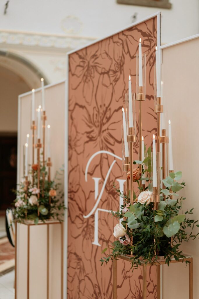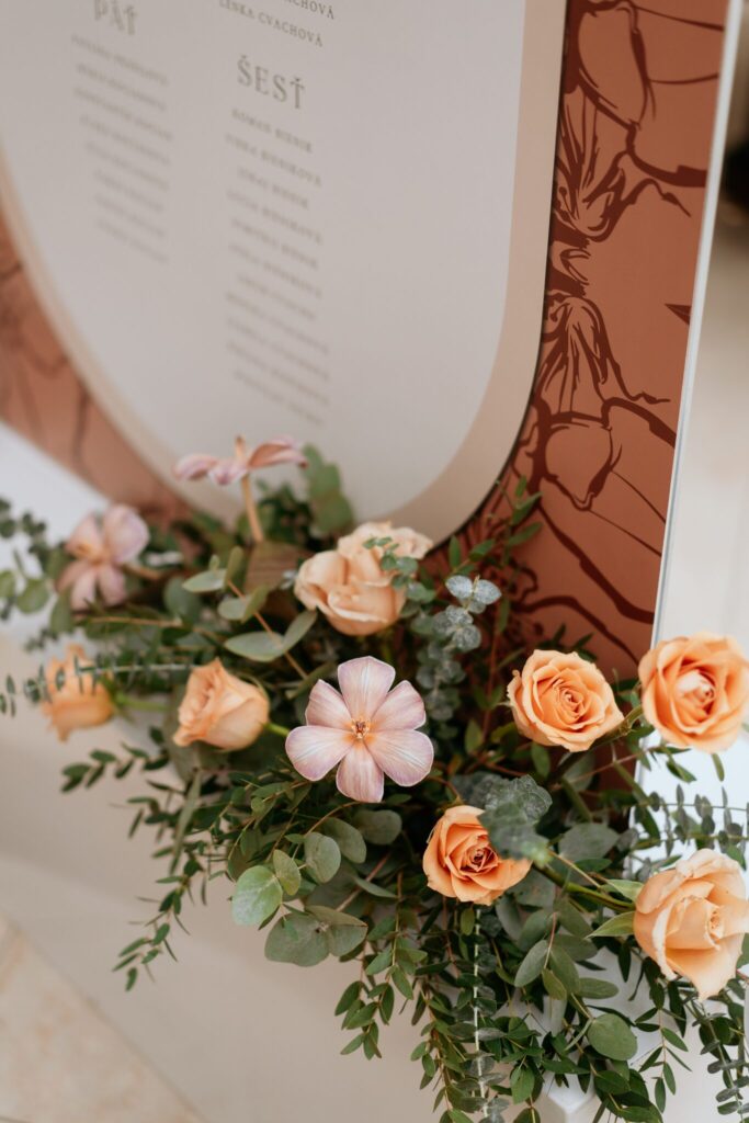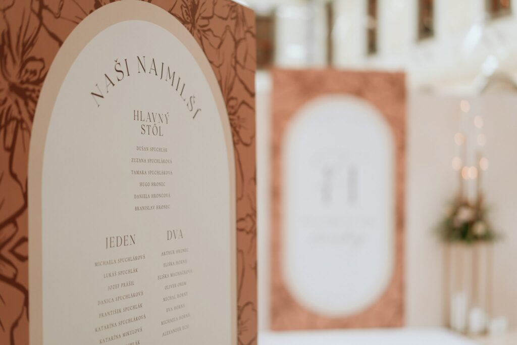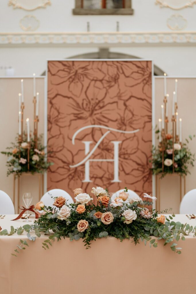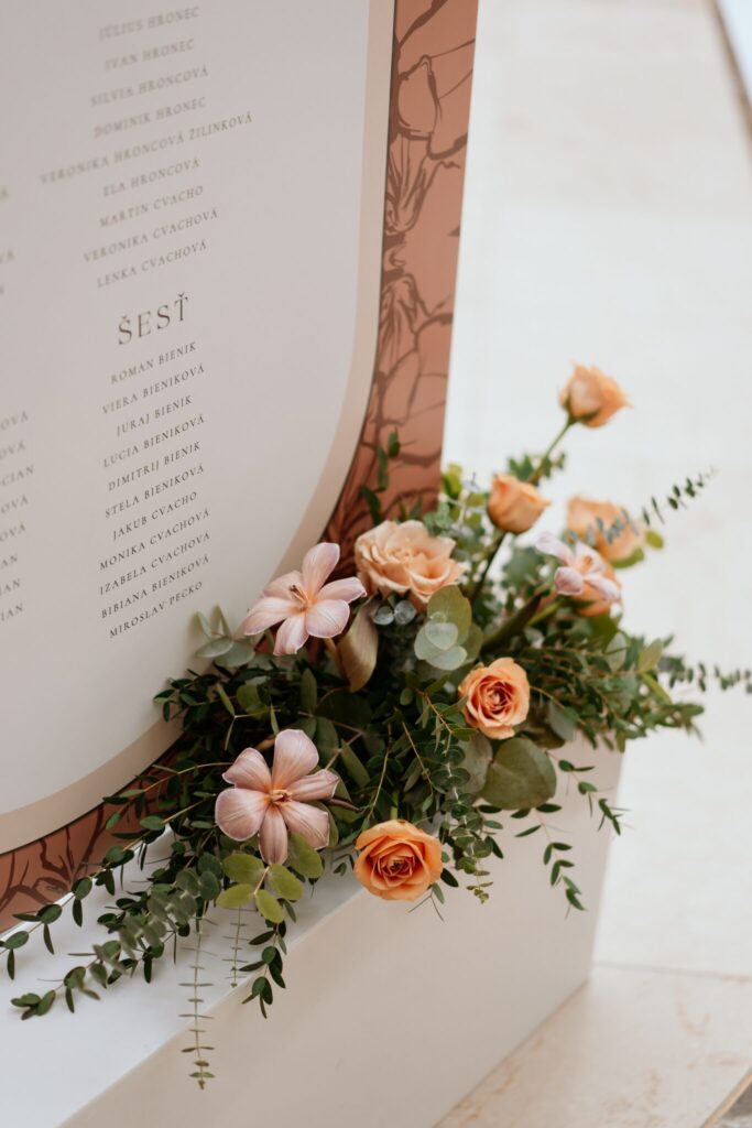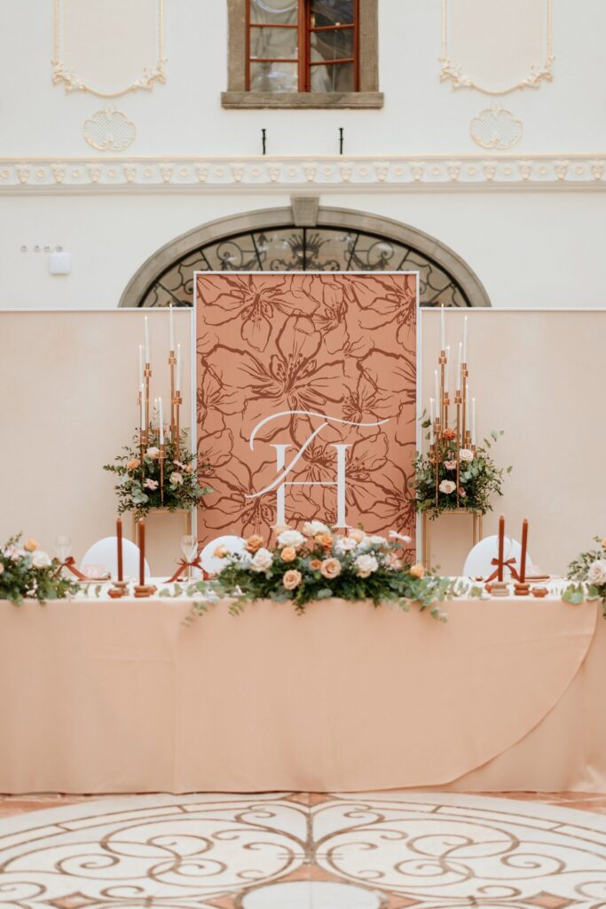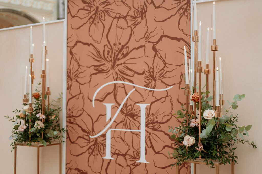 Pre Tamarku a Huga sme pripravili svadobný dizajn Mocha mousse s originálnou uvítacou zónou, ktorá poslúžila ako fotostena pre svadobných hostí a aj ako dokonalé pozadie pre svadobnú romantiku so všetkým, čo k nej patrí :).
